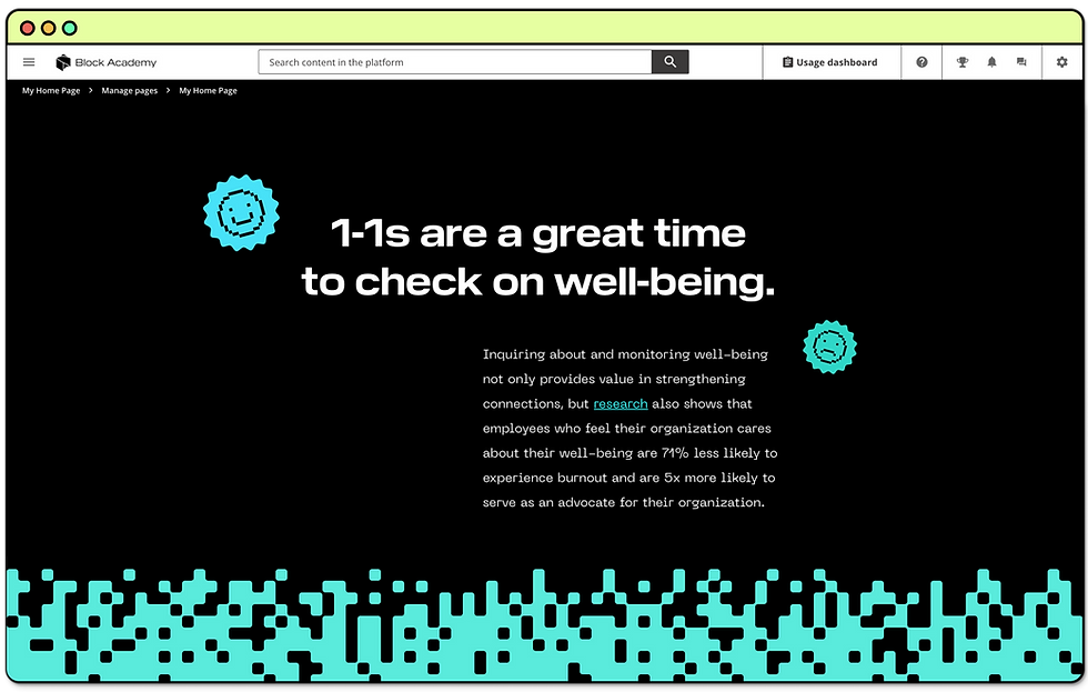 To improve the quality and consistency of asynchronous learning at Block, I led the redesign of our interactive eLearning templates in Articulate RISE. The goal was to create more engaging, on-brand experiences that boost retention, application, and scalability. These drag-and-drop templates made it easy for multiple teams to build high-quality content—quickly and consistently.